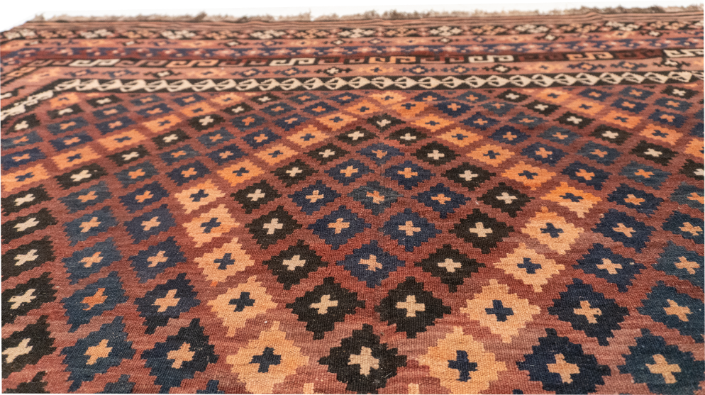 This Kilim is hand-made in 100% wool, composed in a refined all-over vocabulary that reads confident and collected.