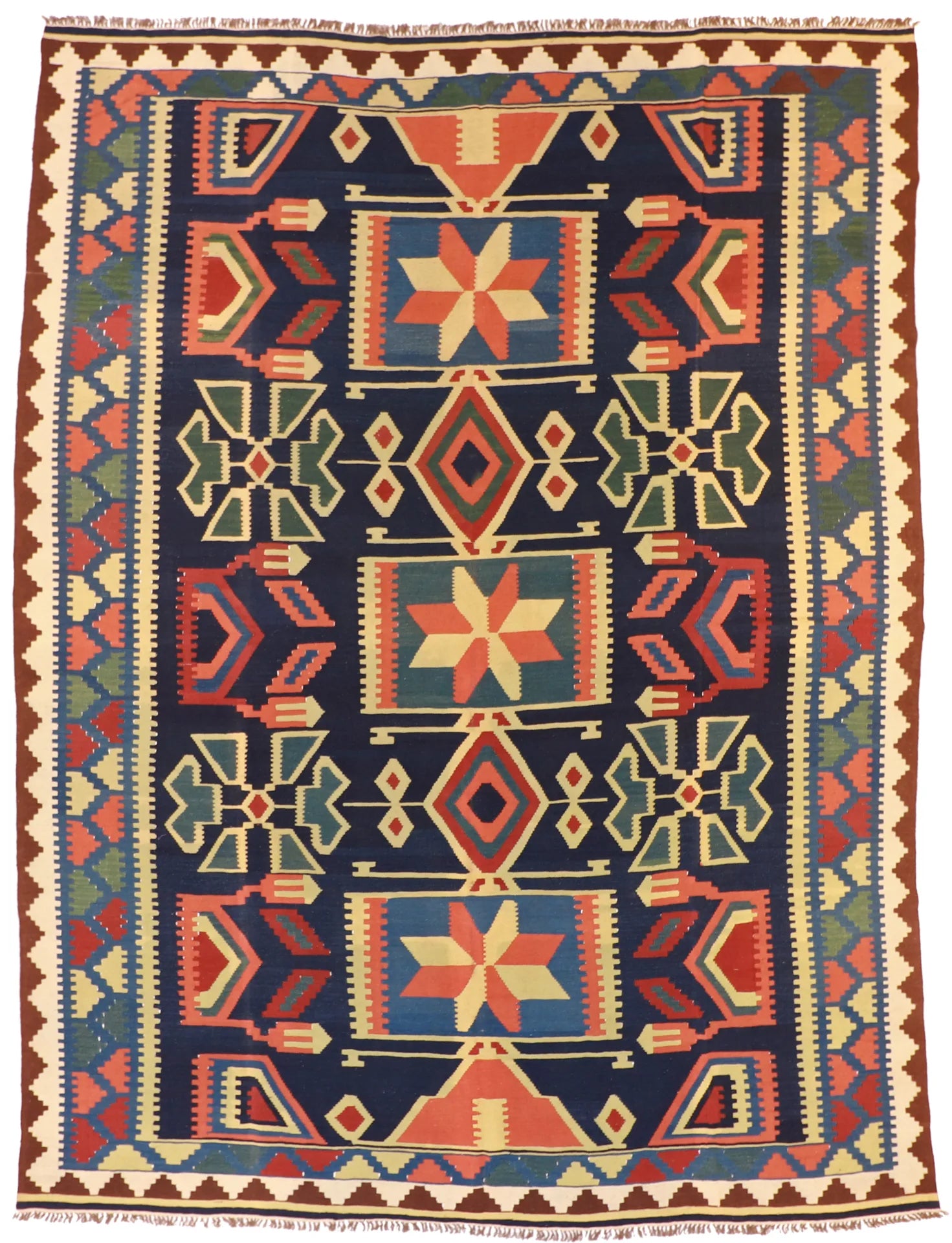 This Kilim is hand-knotted in 100% wool, composed in a refined all-over vocabulary that reads confident and collected.