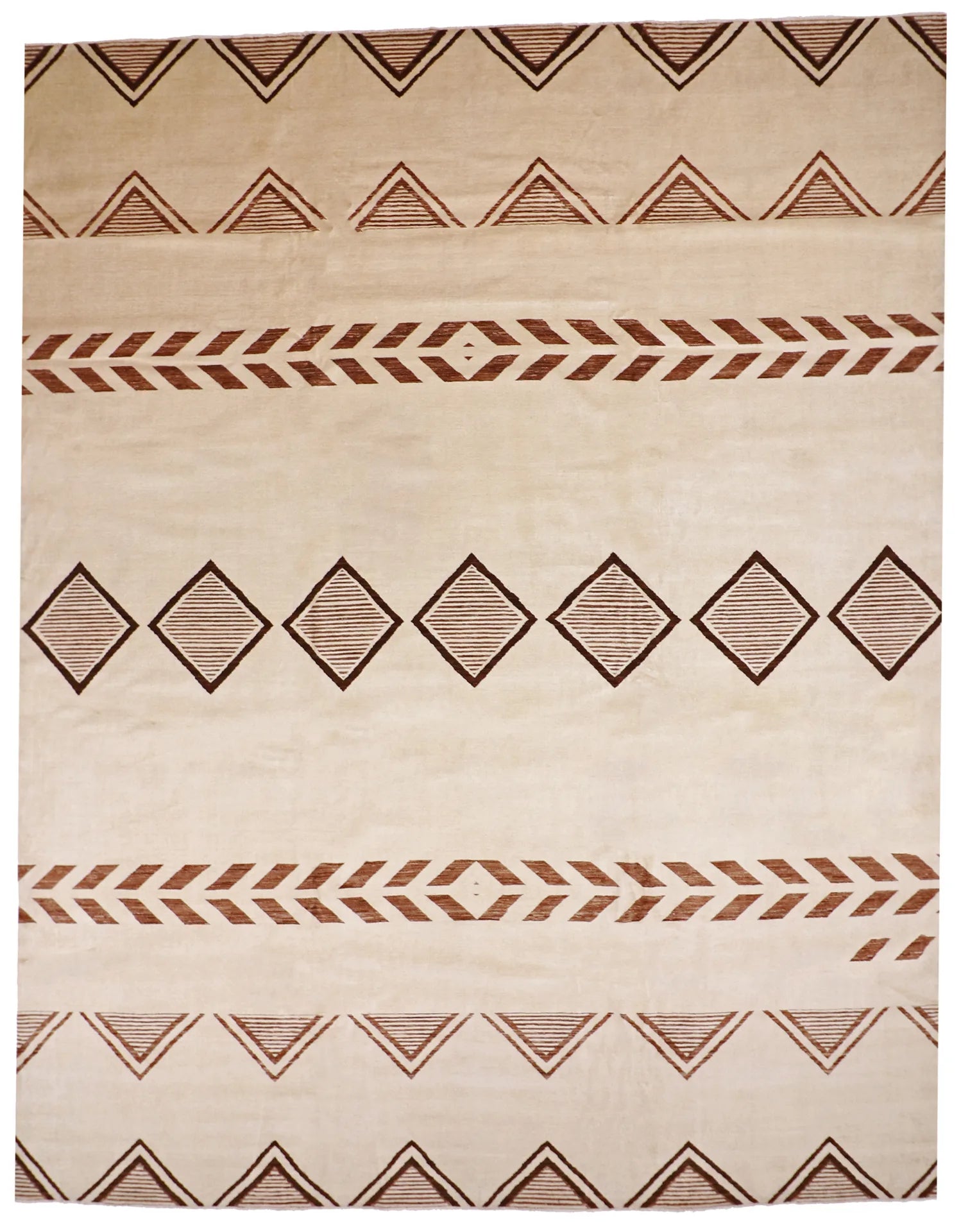 This oversized Mountain Modern is hand-knotted in a wool–silk blend, composed in a refined all-over vocabulary that reads confident and collected.