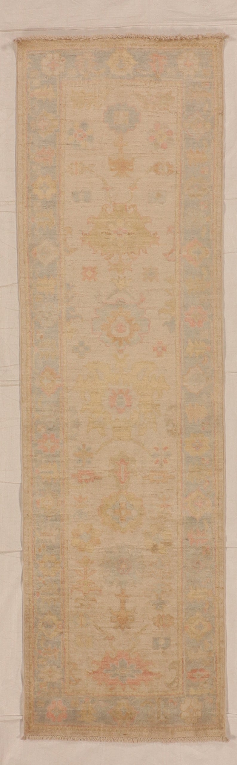 This elegant Oushak Runner showcases a classic Anatolian-inspired layout with softly scaled medallion forms and delicate botanical motifs that feel calm, open, and beautifully refined. The warm ivory ground is framed by a pale sky blue border and subtle floral accents, with touches of muted gold, soft coral, and sage creating a quietly layered palette that reads sophisticated rather than busy.