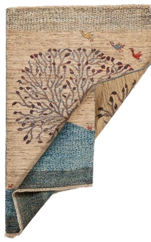 This Tree of Life Rug features a poetic, hand-rendered composition centered around a flourishing tree rising from a softly textured ground. Birds, animals, and symbolic figures are delicately woven throughout, creating a quiet narrative that reflects themes of growth, continuity, and harmony. The restrained palette of sand, sky blue, rust, and soft earth tones lends the rug a calm, contemplative presence. Hand-woven from 100% wool, this 2′7″ × 4′0″ piece is ideal for intimate spaces where storytelling and craftsmanship take center stage.