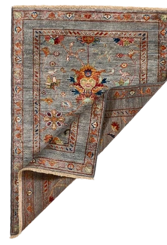 This Tabriz Rug features elegant scrolling florals across a soft blue field, framed by a refined border for balance. Hand-woven from 100% wool, this 2′8″ × 4′0″ rug suits entryways, bedside placement, or intimate spaces with subtle pattern.