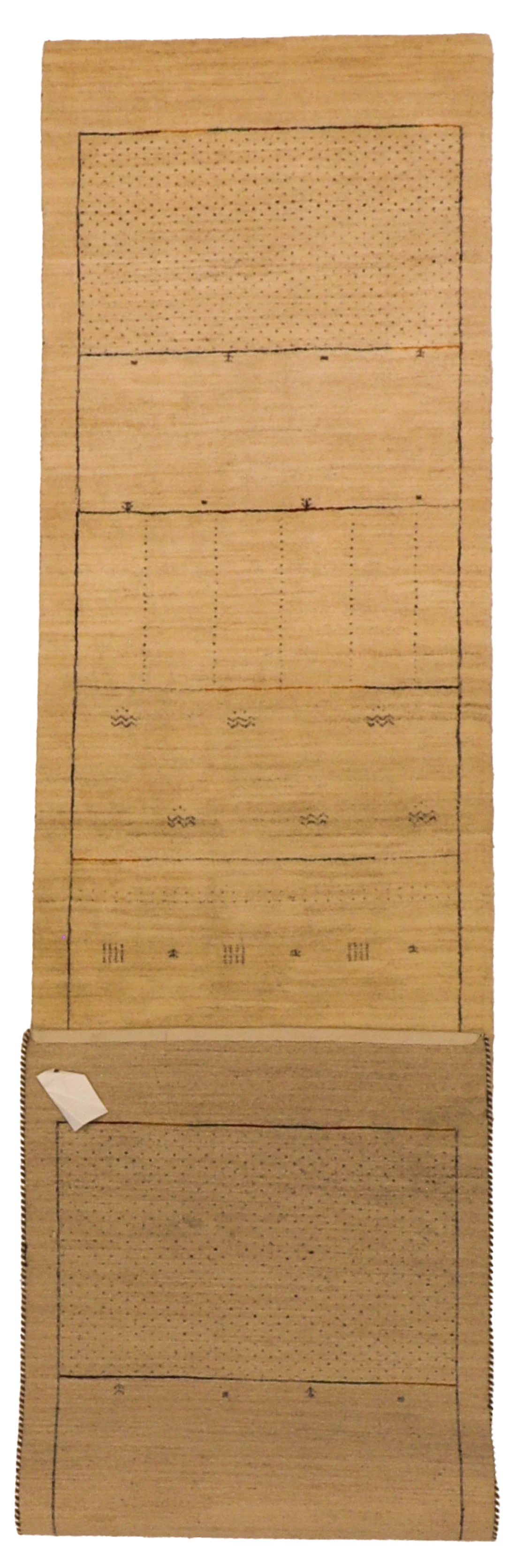 Mountain Modern Runner features a segmented minimalist design with fine linear outlines and subtle symbolic accents. Its warm, restrained palette creates a calm, architectural feel. Hand-woven from