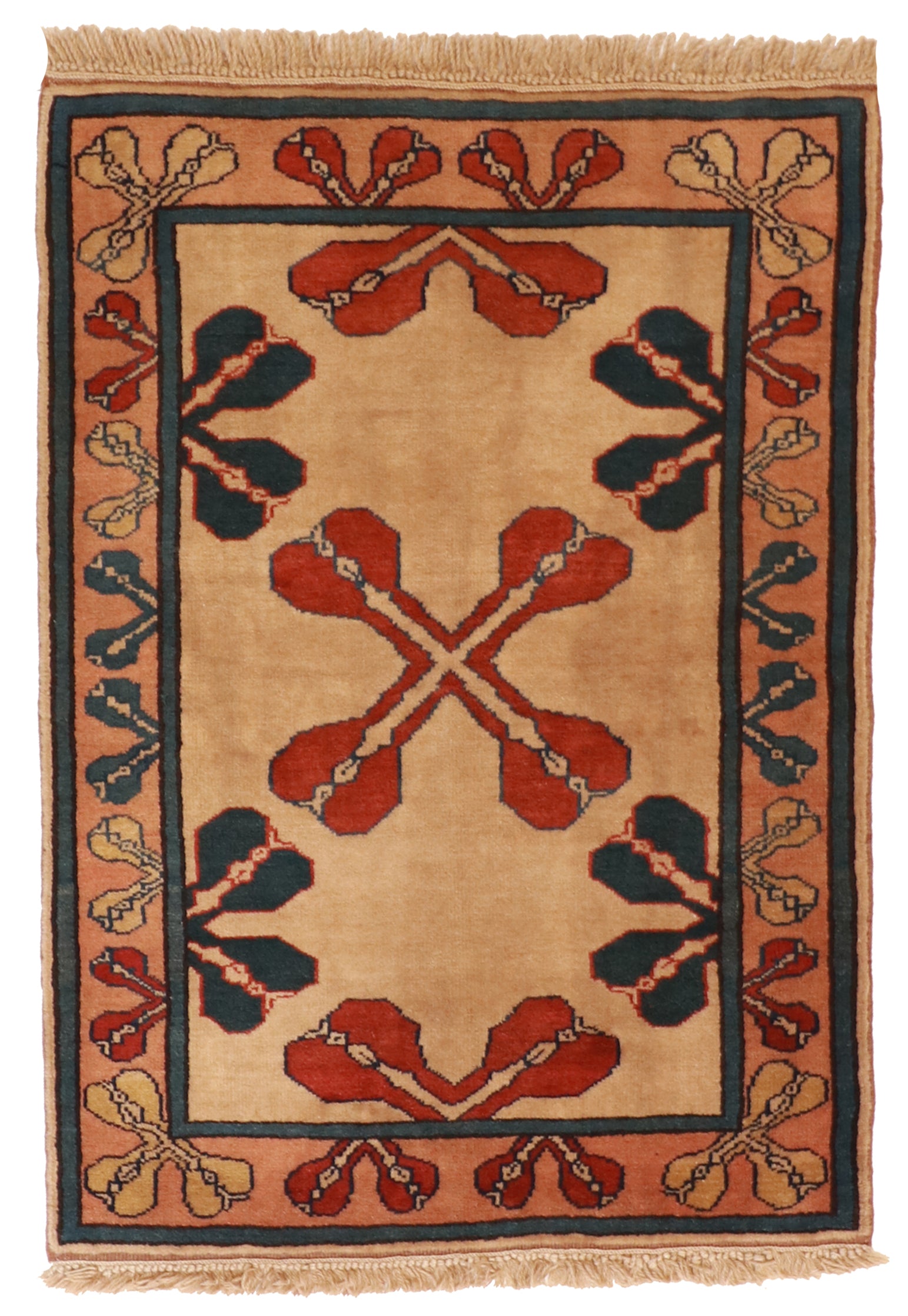This Kazak Rug features a commanding geometric composition anchored by bold cross motifs set against a warm camel-toned field. Framed by a richly patterned border in rust, ivory, and deep teal, the design reflects the confident structure and folkloric symbolism characteristic of traditional Kazak weaving. Hand-woven from 100% wool, this 3′1″ × 4′4″ rug offers durability, texture, and visual strength—ideal for entryways, offices, or layered interiors.