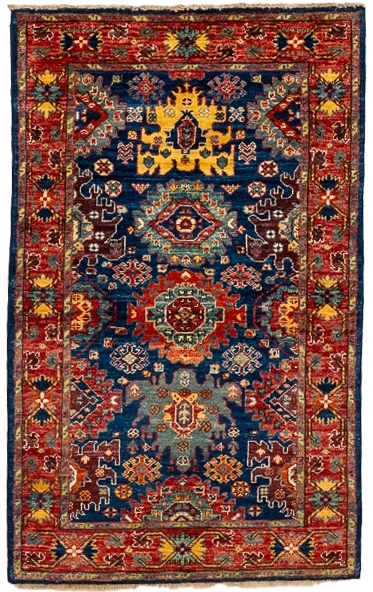 This Mahal Rug showcases a richly layered field filled with dynamic geometric medallions, angular motifs, and rhythmic ornamentation drawn from classical Mahal weaving traditions. A deep indigo-blue ground anchors vivid accents of brick red, golden yellow, ivory, and soft teal, creating a composition that feels energetic yet balanced. Hand-woven from 100% wool, this 3′1″ × 5′0″ piece brings color, structure, and heritage character to intimate living spaces.
