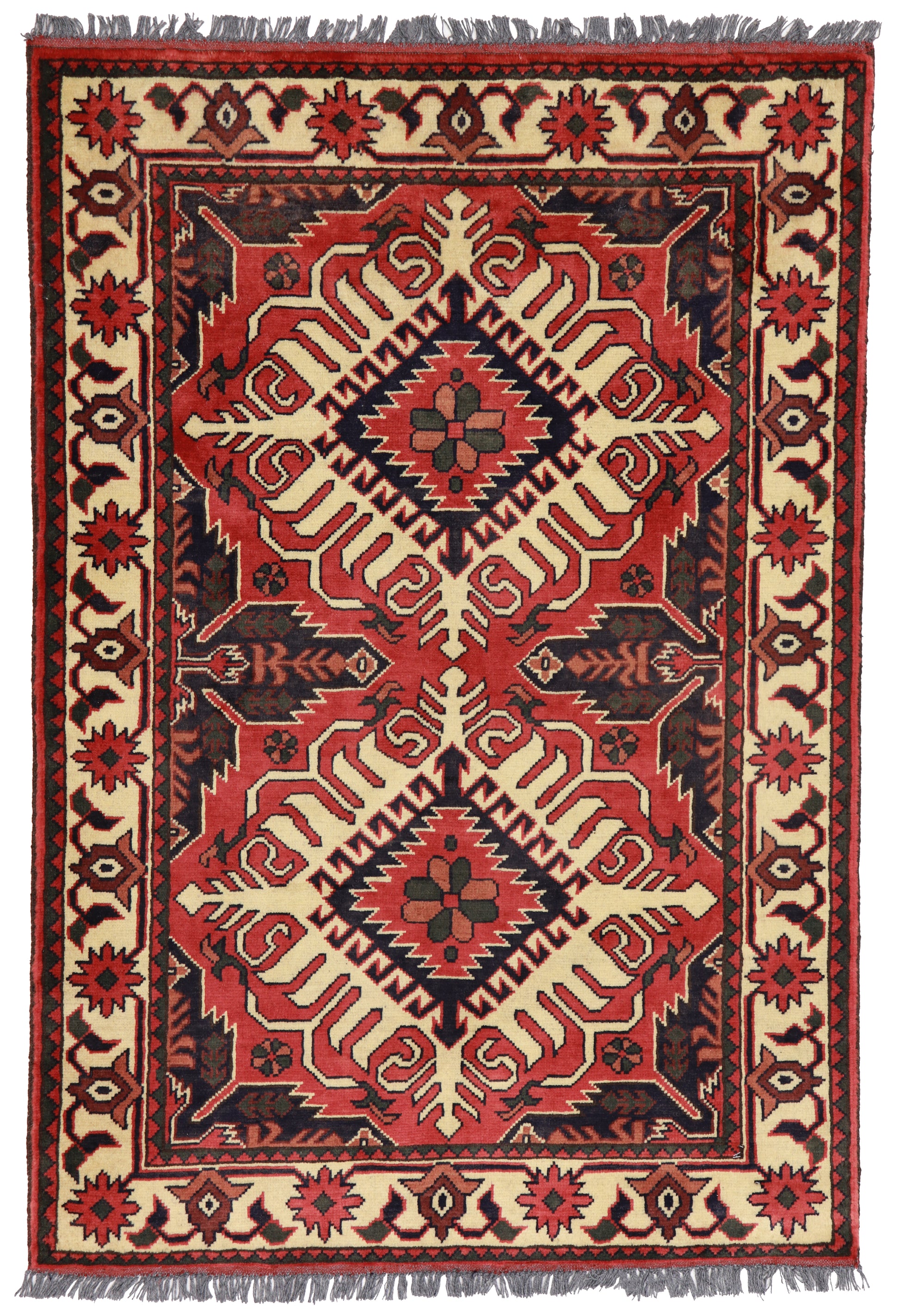 This Kazak Rug features a powerful, symmetrical composition anchored by stacked diamond medallions rendered in deep red, ivory, charcoal, and earthy green. The bold geometry is framed by animated tribal borders filled with stylized florals and angular motifs, creating a dynamic yet grounded visual rhythm. Hand-woven from 100% wool, this 3′5″ × 5′0″ rug brings warmth, structure, and heritage presence to entryways, offices, or layered living spaces.