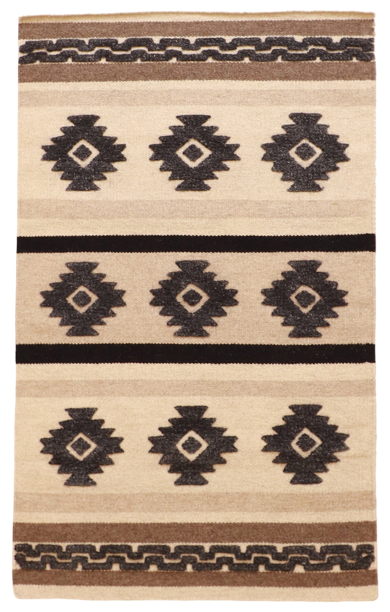 This Mountain Modern Rug features crisp horizontal bands and stepped diamond motifs in a calm, neutral palette. Hand-woven from 100% wool, this 3′0″ × 5′0″ rug delivers modern structure with an easy, grounded feel.
