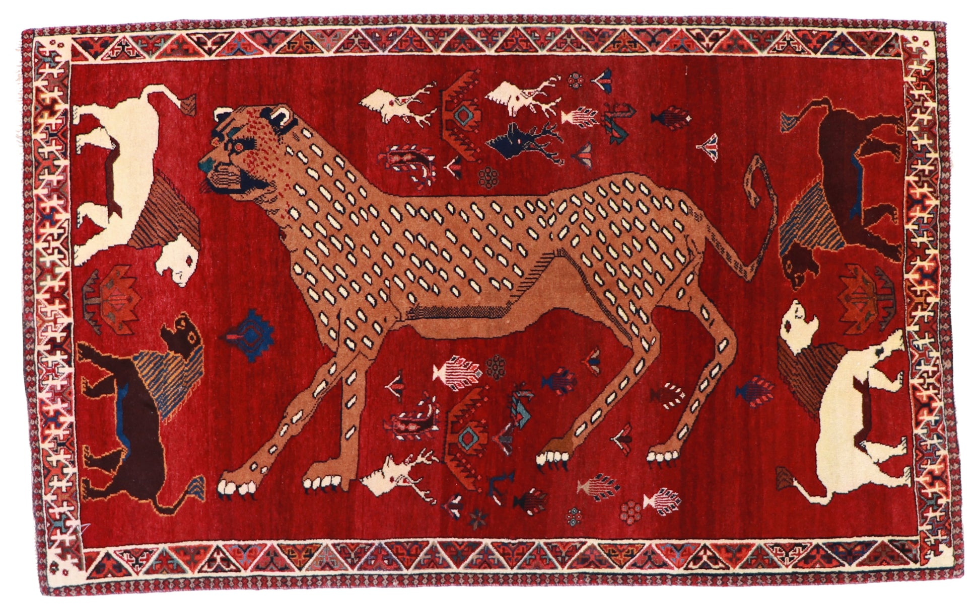 This Gashgaie Rug features a powerful central feline figure set against a saturated red field, surrounded by smaller symbolic animals and tribal motifs. The composition reflects the storytelling tradition of Gashgaie weaving, where expressive imagery and bold color take precedence over formal symmetry. Hand-woven from 100% wool, this rug offers warmth, durability, and striking visual presence in a versatile 4′1″ × 6′8″ size.