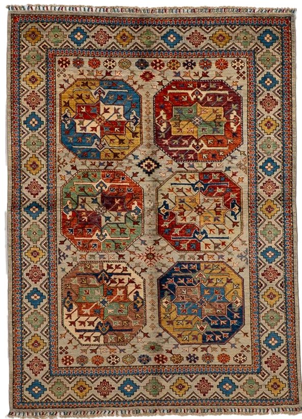This Turkaman Rug features a traditional all-over composition defined by bold octagonal medallions arranged across a finely detailed field. Saturated reds, blues, golds, and ivory accents create depth and visual rhythm, while the intricate border frames the design with classic Central Asian character. Hand-woven from 100% wool, it offers durability and warmth in a versatile 4′11″ × 6′9″ size.