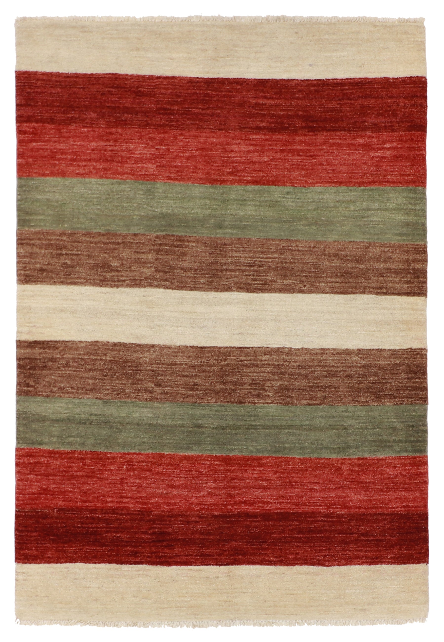 This Loribaft Rug features gently shifting horizontal bands that blend rich reds, warm neutrals, and muted greens into a calm, modern composition. Hand-woven from 100% wool, this 4′2″ × 6′1″ piece offers exceptional softness, durability, and understated elegance—perfect for relaxed interiors seeking texture and warmth.