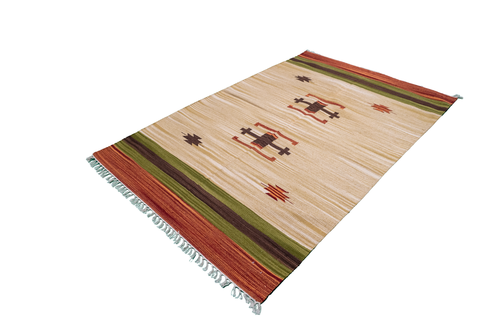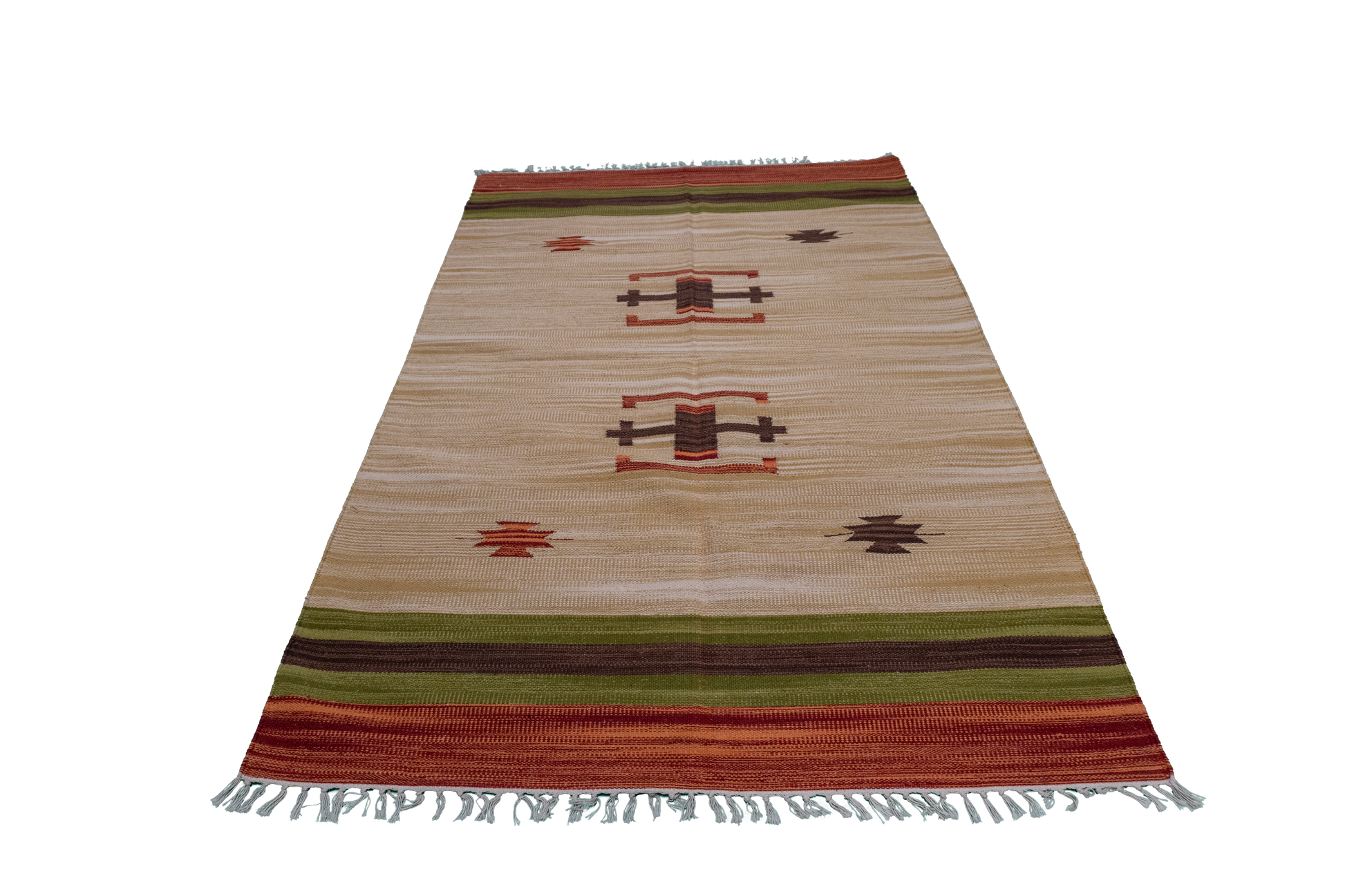 Kilim wool rug with geometric field design, SKU 60512, size 4′0″ × 6′0″, hand-woven in 100% wool.