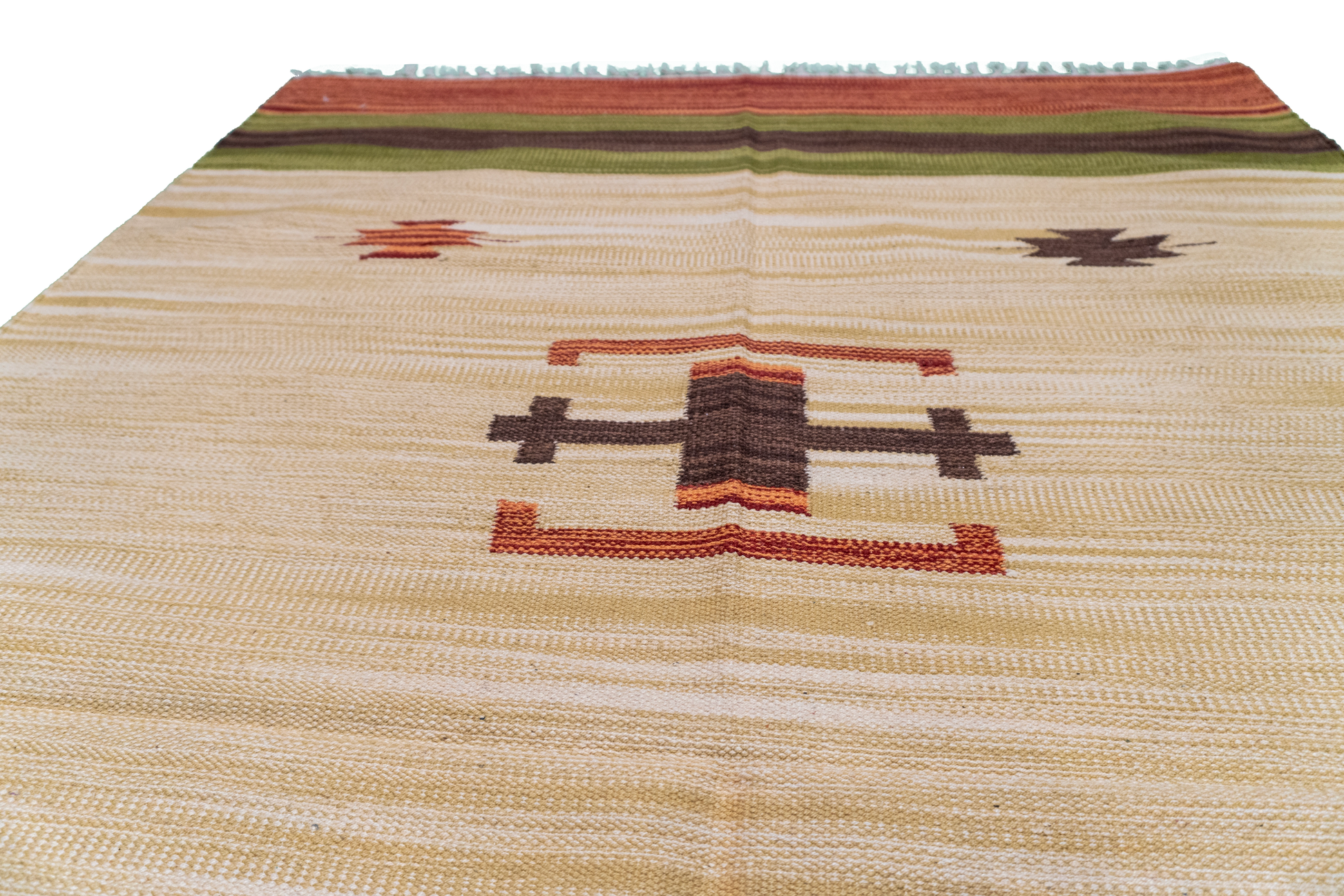 This Kilim Rug features a calm, open field accented by simple geometric motifs and framed by softly layered bands. Hand-woven from 100% wool, it offers a lightweight, durable surface and, at 4′0″ × 6′0″, brings warmth and relaxed character to living spaces, bedrooms, or offices.