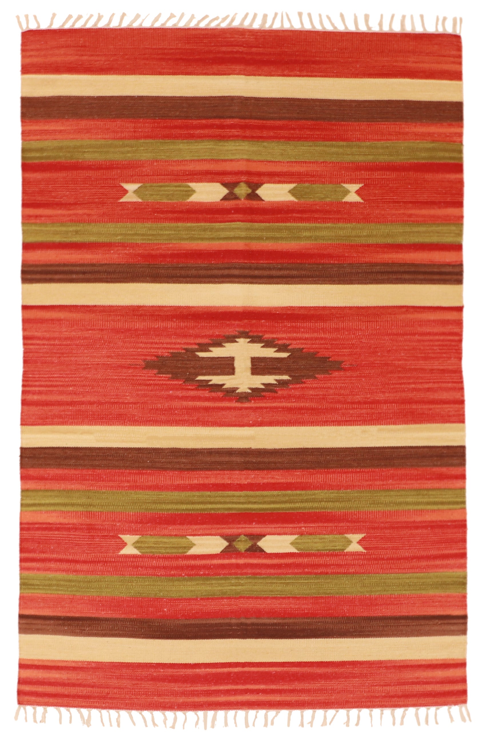 This Kilim Rug features rhythmic horizontal striping enriched with bold color transitions and traditional geometric motifs that add visual depth and cultural character. Hand-woven from 100% wool, this 4′0″ × 6′0″ piece offers durability, texture, and timeless appeal—perfect for both modern and traditional interiors.
