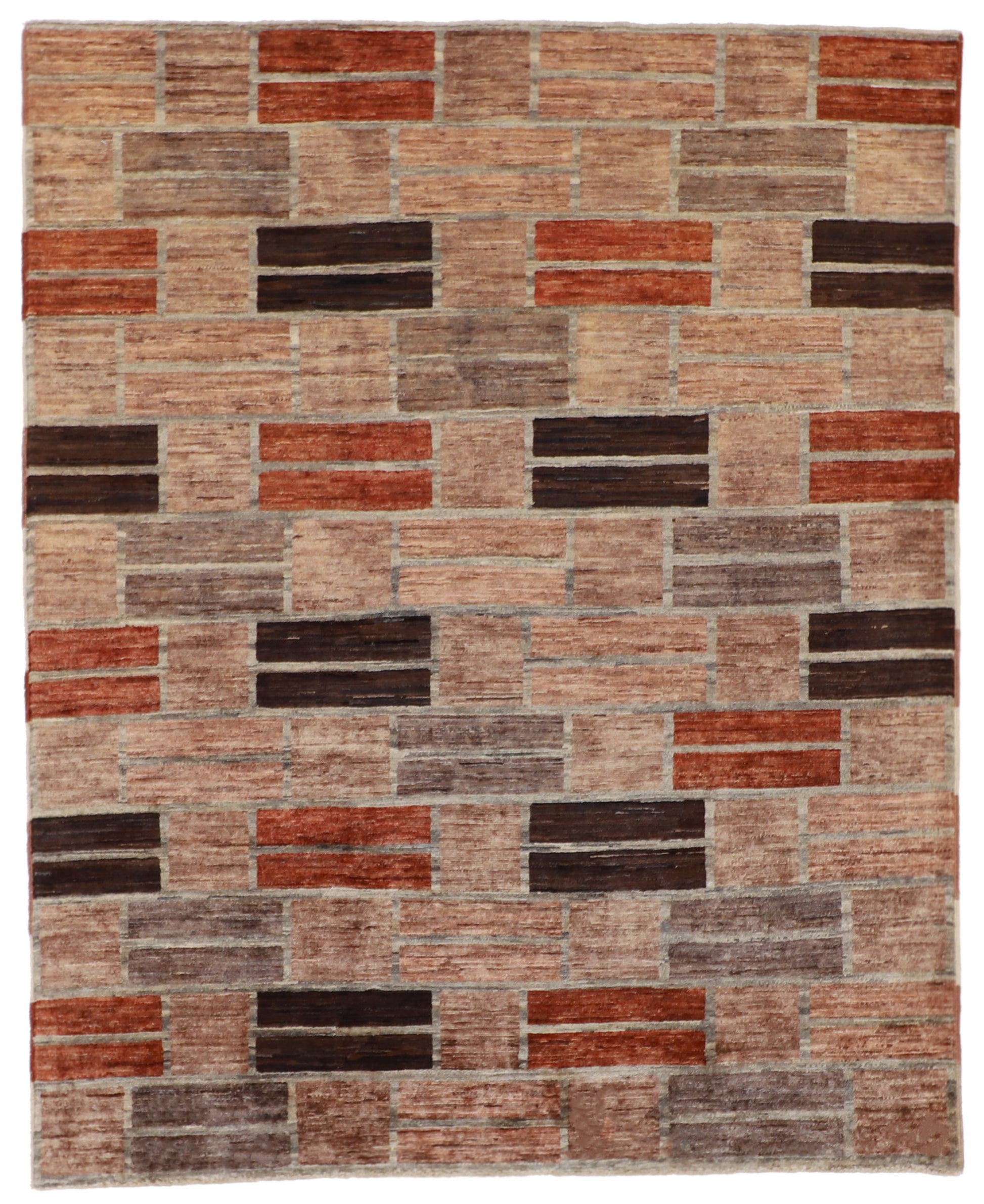 This Modern Rug features a rhythmic arrangement of rectangular blocks layered in warm earth tones, creating a subtle architectural grid with natural depth and texture. The restrained palette of terracotta, sand, cocoa, and soft gray allows the design to feel contemporary yet grounded. Hand-woven from 100% wool, this rug offers durability and softness in a versatile 5′1″ × 6′3″ size well suited for living areas, bedrooms, or offices.