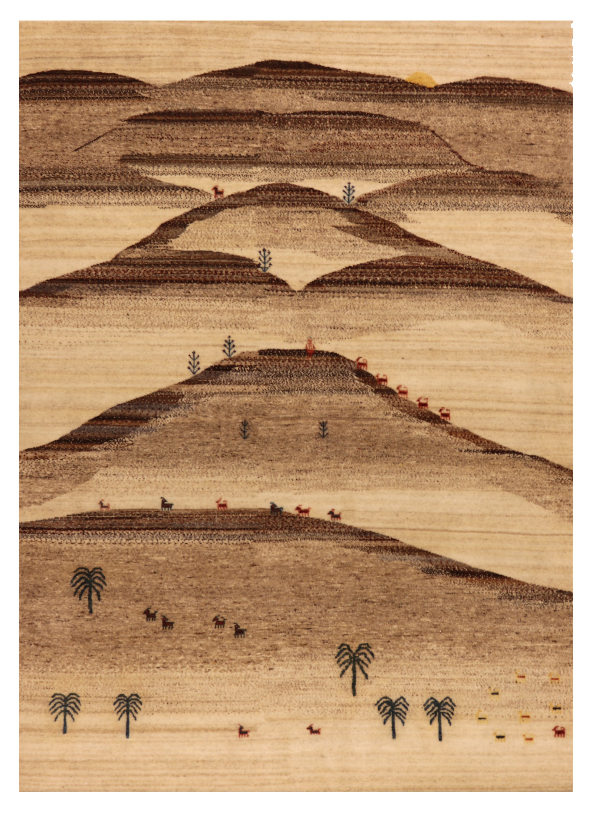 Layered hills, trees, and animals create a woven pastoral scene.