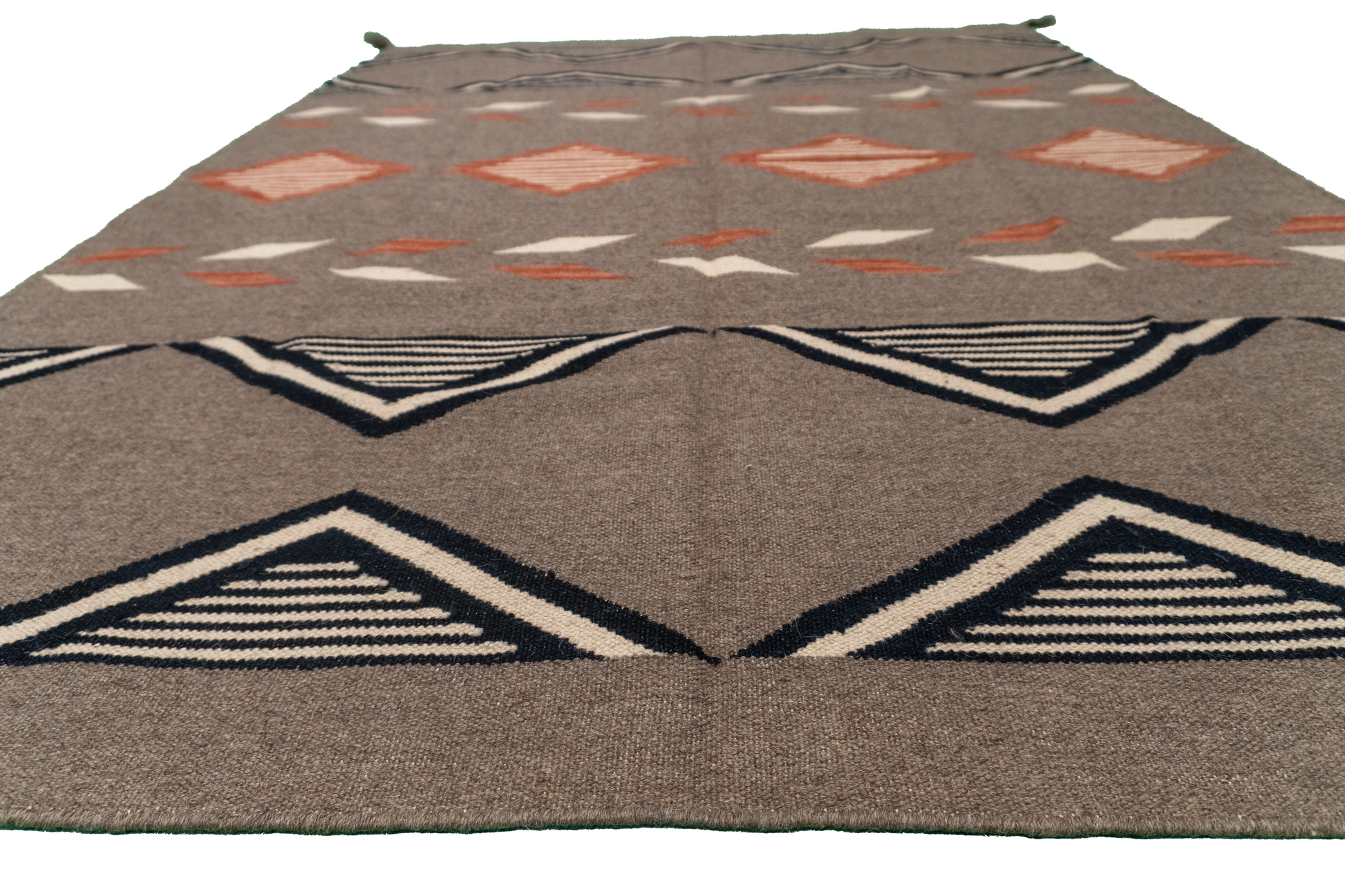This Kilim Rug features layered geometric bands with repeating diamond motifs and directional accents. Hand-woven from 100% wool, it offers a flat, durable surface and, at 5′2″ × 6′11″, adds structure and warmth to living spaces and offices.