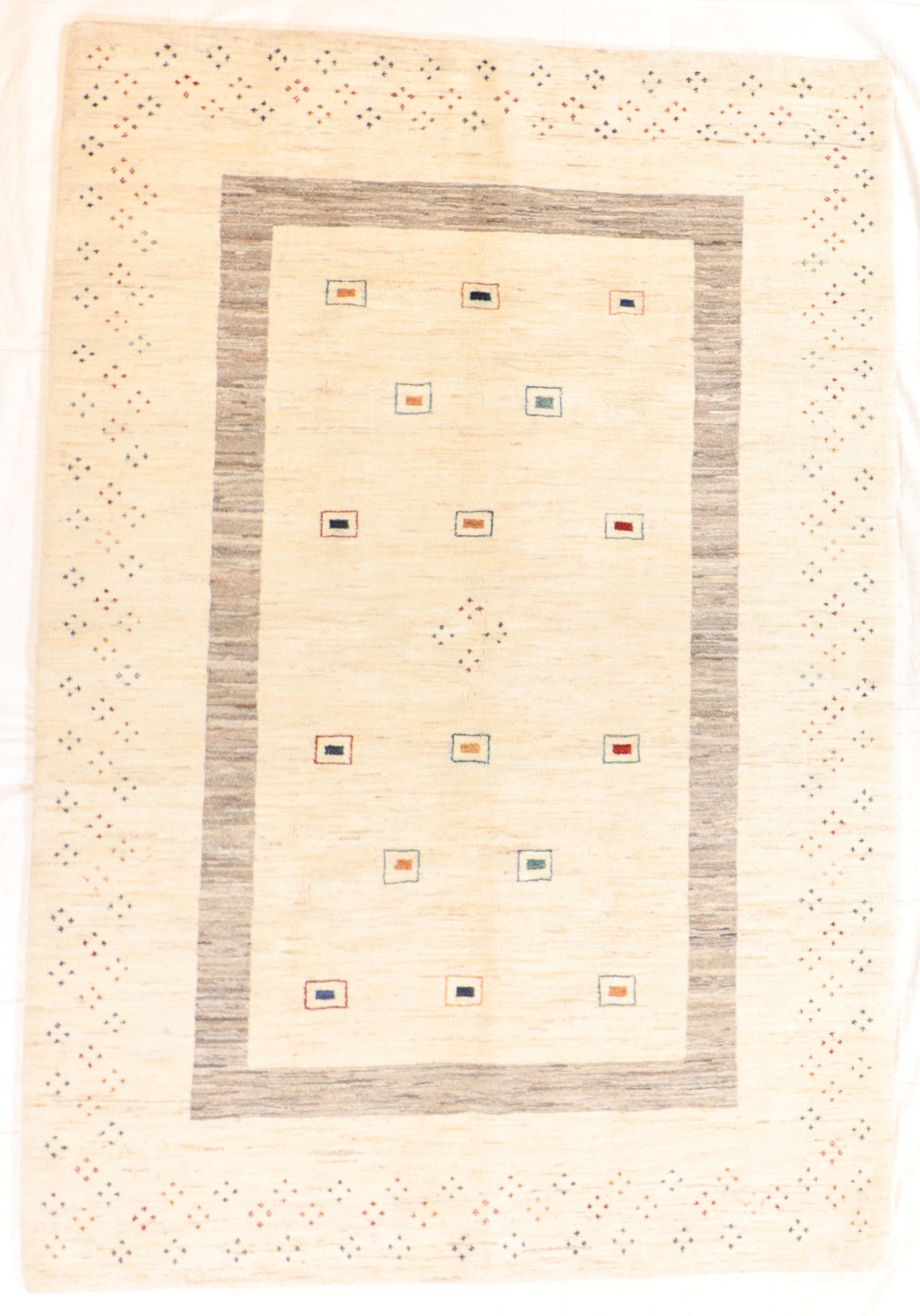 This Gabbeh Rug features a softly layered field framed by a tonal border, punctuated with small, colorful geometric motifs that bring gentle rhythm and charm to the composition. The design is intentionally restrained, allowing texture and spacing to take center stage while subtle pops of color add warmth and personality.