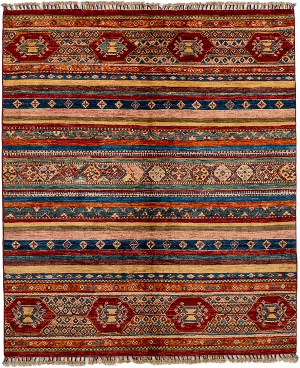 This Baluch Rug features a rhythmic series of horizontal bands accented by tribal motifs and geometric medallions, creating a vibrant and textural composition. Hand-woven from 100% wool, this 5′0″ × 5′10″ piece offers durability, warmth, and timeless character—perfect for both traditional and eclectic interiors.