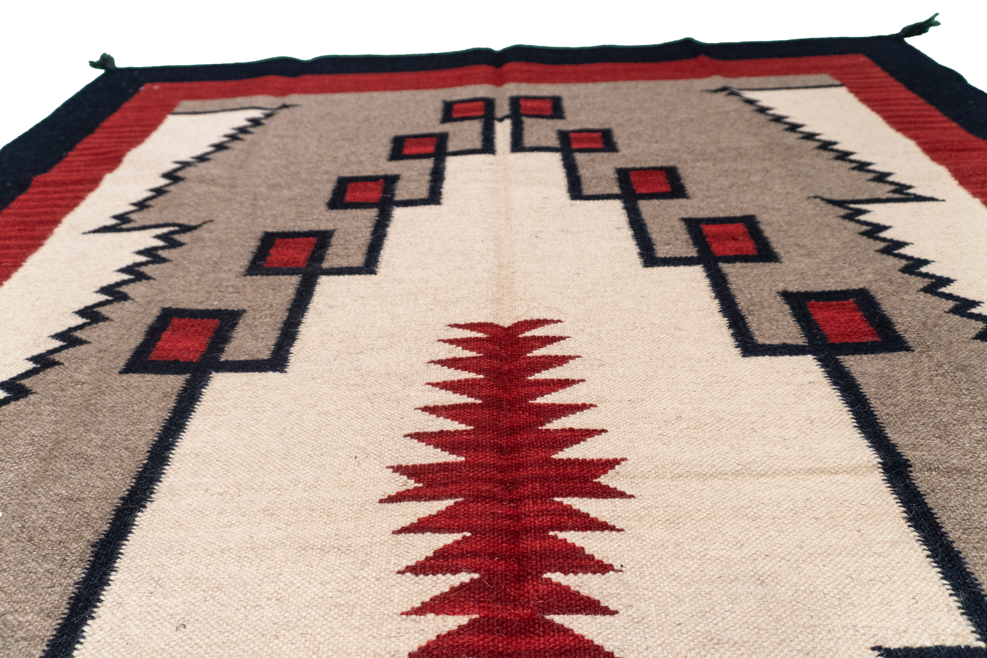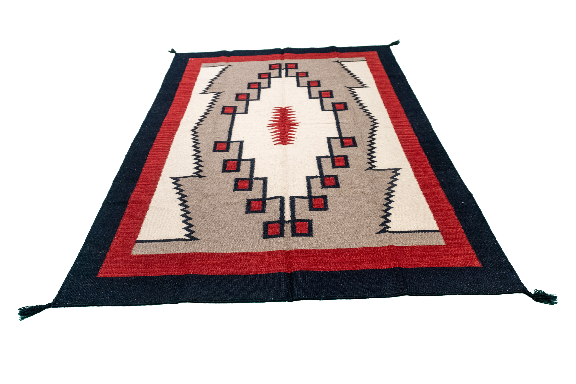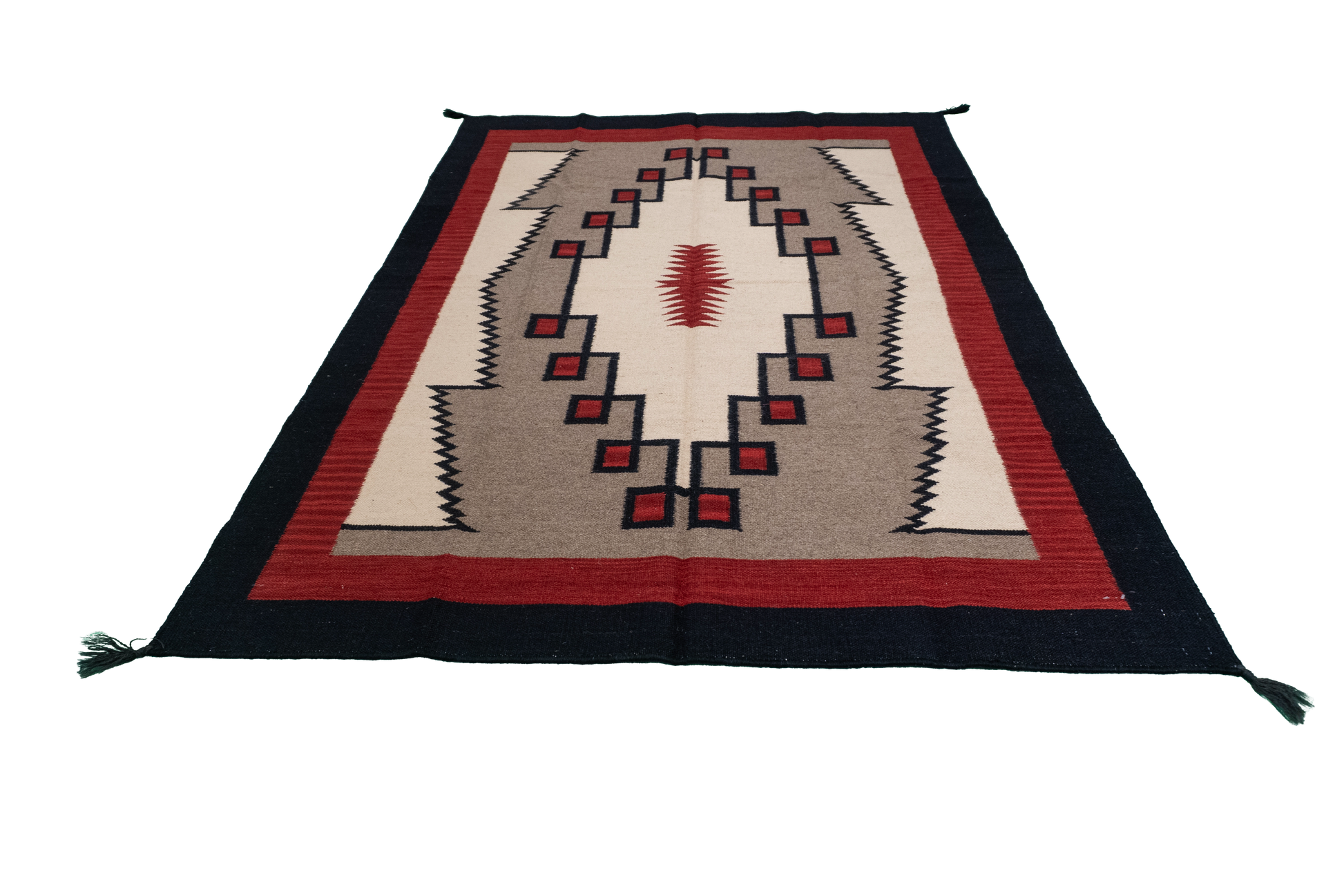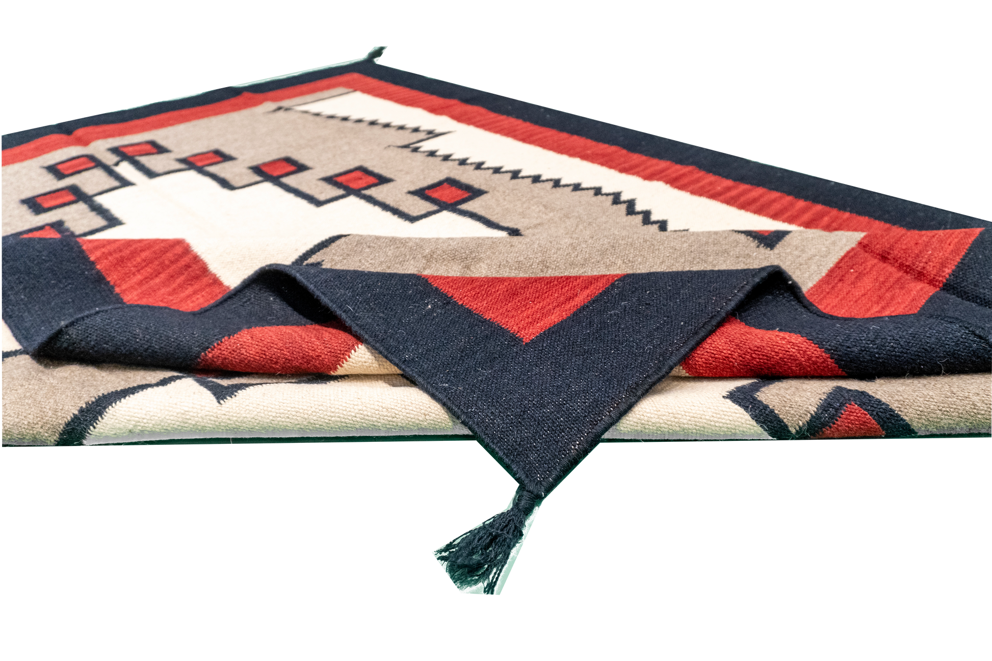 This Kilim Rug features a bold central medallion framed by stepped geometric motifs and a high-contrast border. Hand-woven from 100% wool, it offers a flat, durable surface and, at 5′0″ × 6′11″, works well in living spaces that welcome strong pattern and graphic presence.