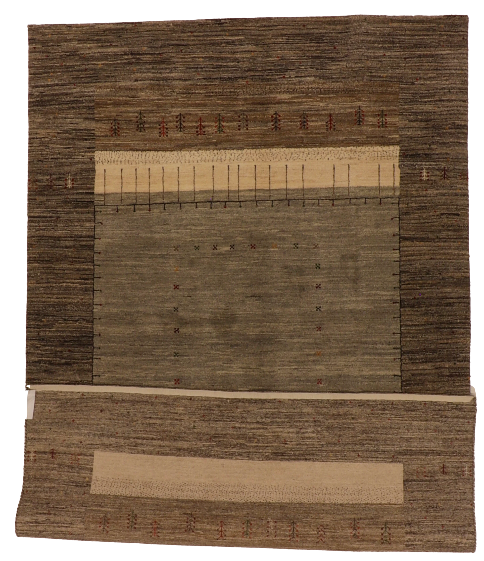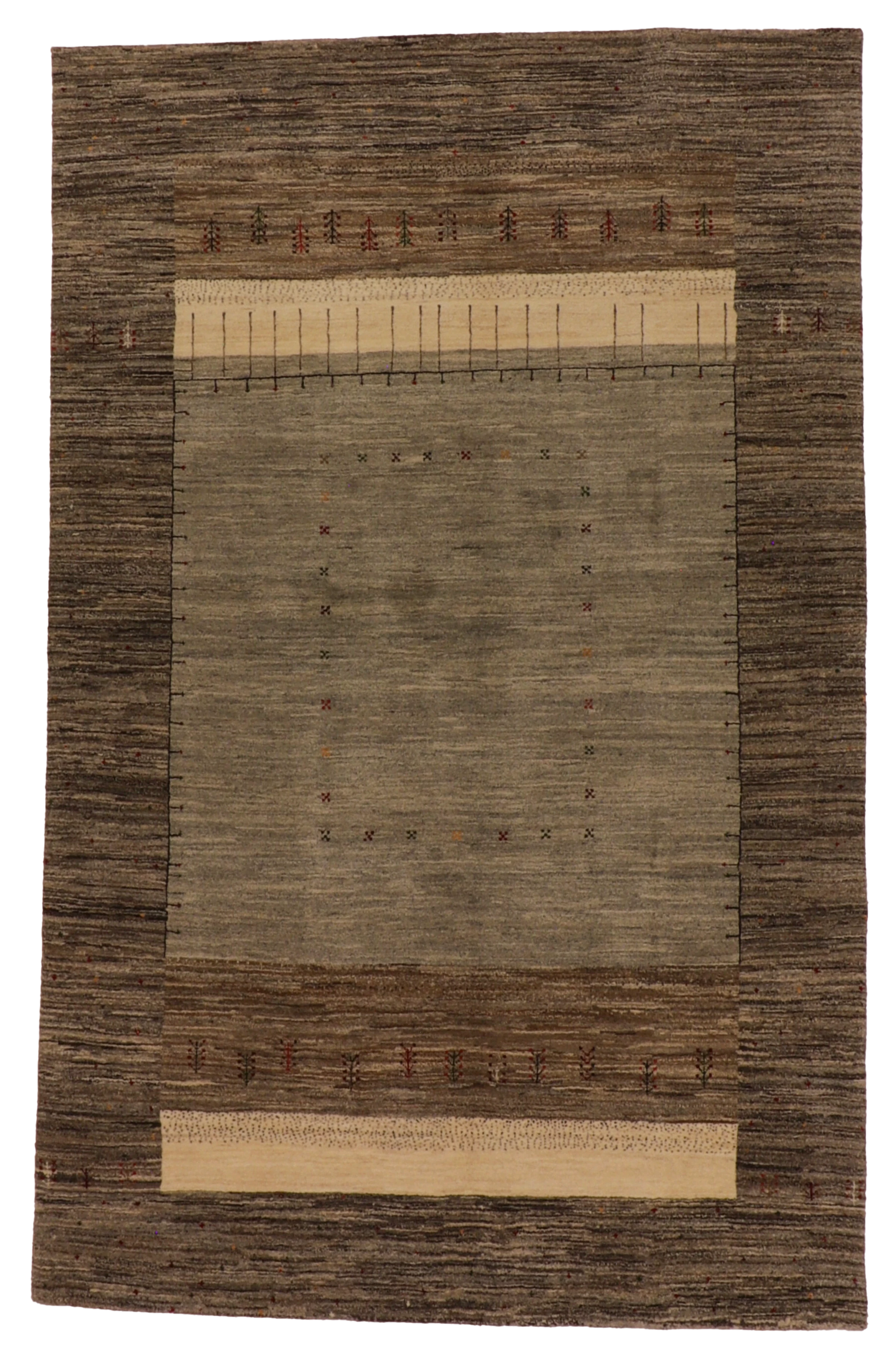 This Mountain Modern Rug features a softly framed central field surrounded by tonal bands and fine symbolic accents that add quiet depth without visual weight. Hand-woven from 100% wool, it offers a smooth, durable feel and, at 6′0″ × 9′3″, is well suited for living spaces, bedrooms, or offices seeking warmth and restraint.