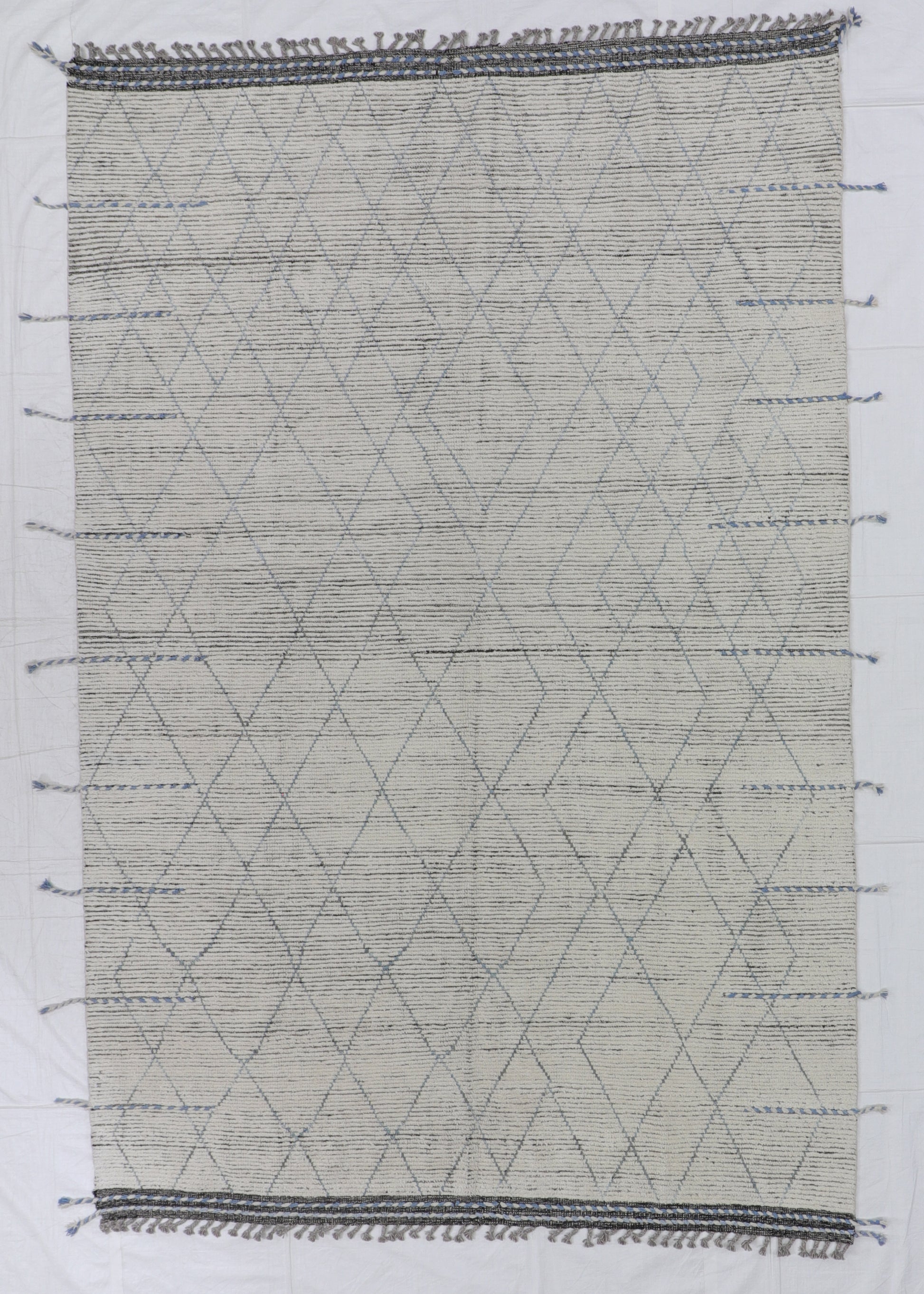 This Moroccan rug brings a serene, contemporary interpretation of classic Berber design. Its soft ivory field is traced with an airy network of hand-drawn diamond and linear motifs in pale grey and washed denim blue, creating a subtle, modern rhythm that feels both artisanal and understated. The lightly variegated wool and delicate striations add depth and movement while maintaining a clean, calming aesthetic.