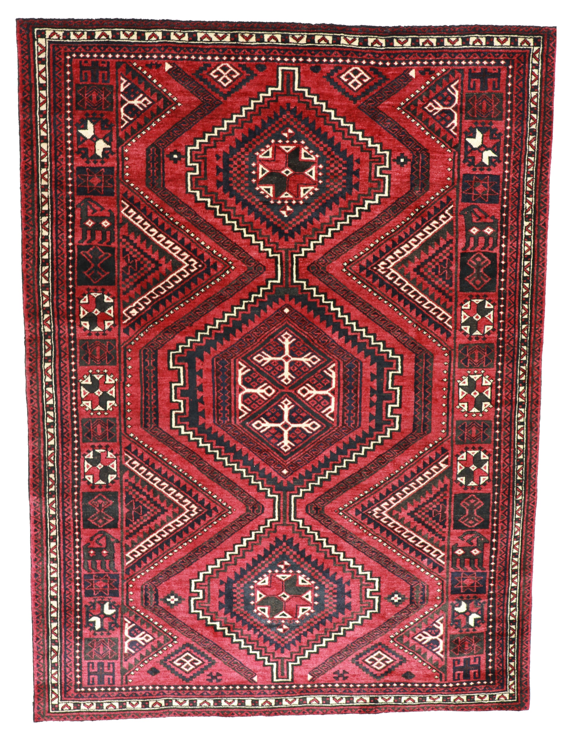 This Lori rug delivers classic tribal energy with its stacked hexagonal medallions, stepped borders, and intricate geometric symbols. The saturated red field and deeply layered patterning make it a striking focal point for rooms that lean eclectic, rustic, or mountain modern.