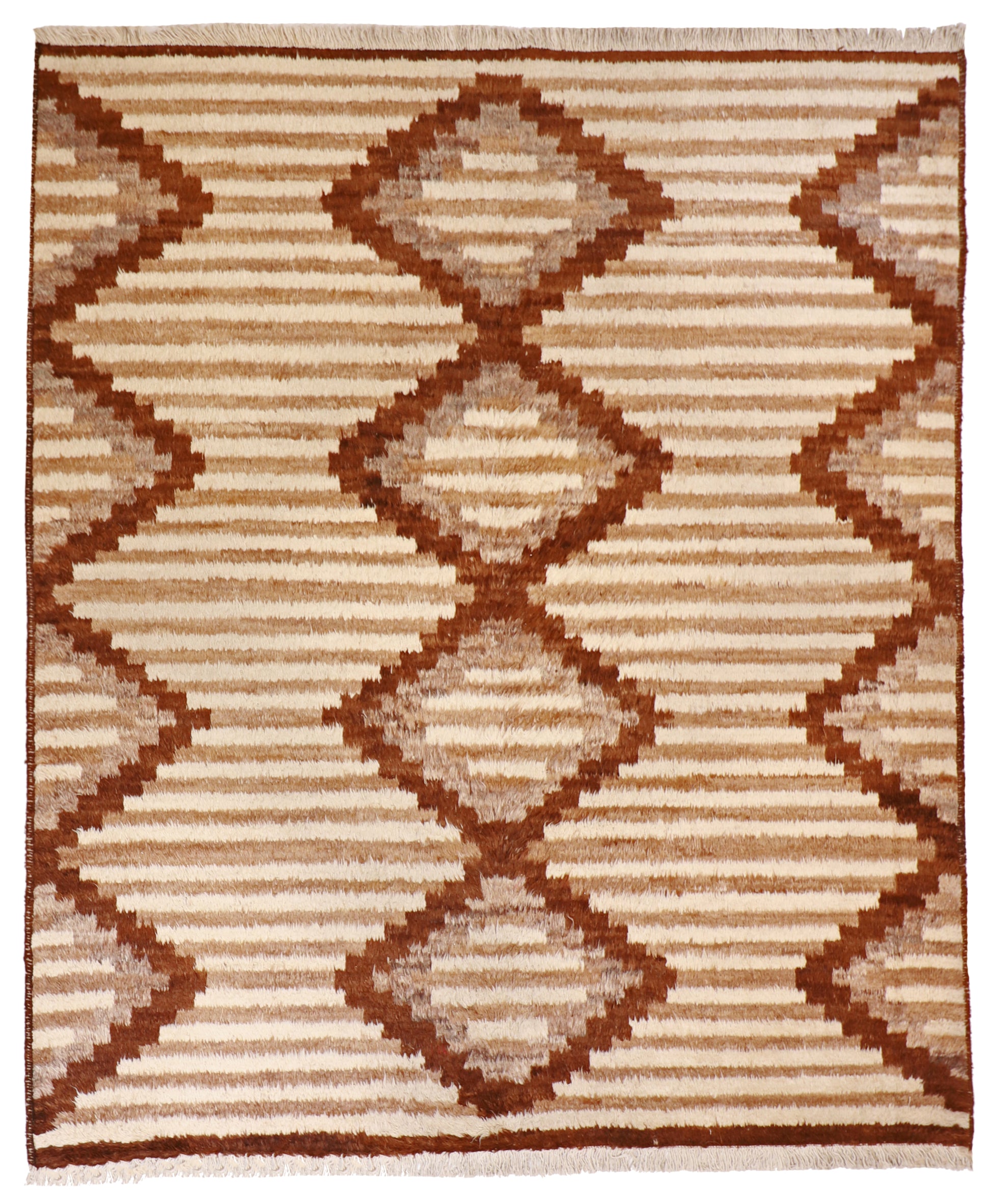 This Moroccan rug is hand-knotted in 100% wool, composed in a bold geometric stripe vocabulary. Horizontal bands of cream and sand are stepped into diamond medallions framed by a rich terracotta border, creating a strong yet inviting rhythm across the field.