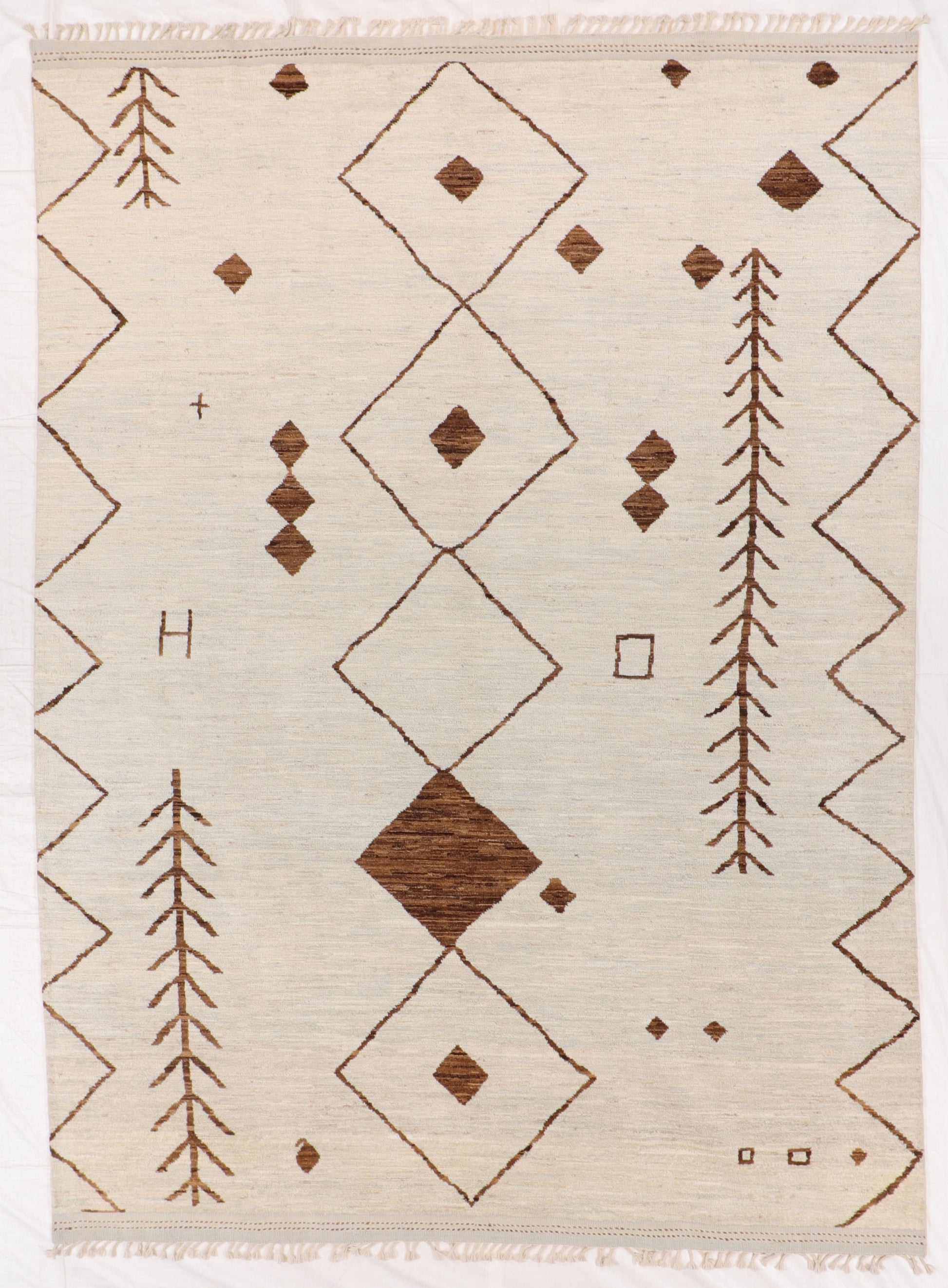This Moroccan Rug showcases a refined, minimalist layout built around elongated diamond medallions, linear motifs, and symbolic forms drawn from traditional North African weaving. Set against a soft ivory ground, warm brown geometry creates a calm yet visually engaging rhythm.