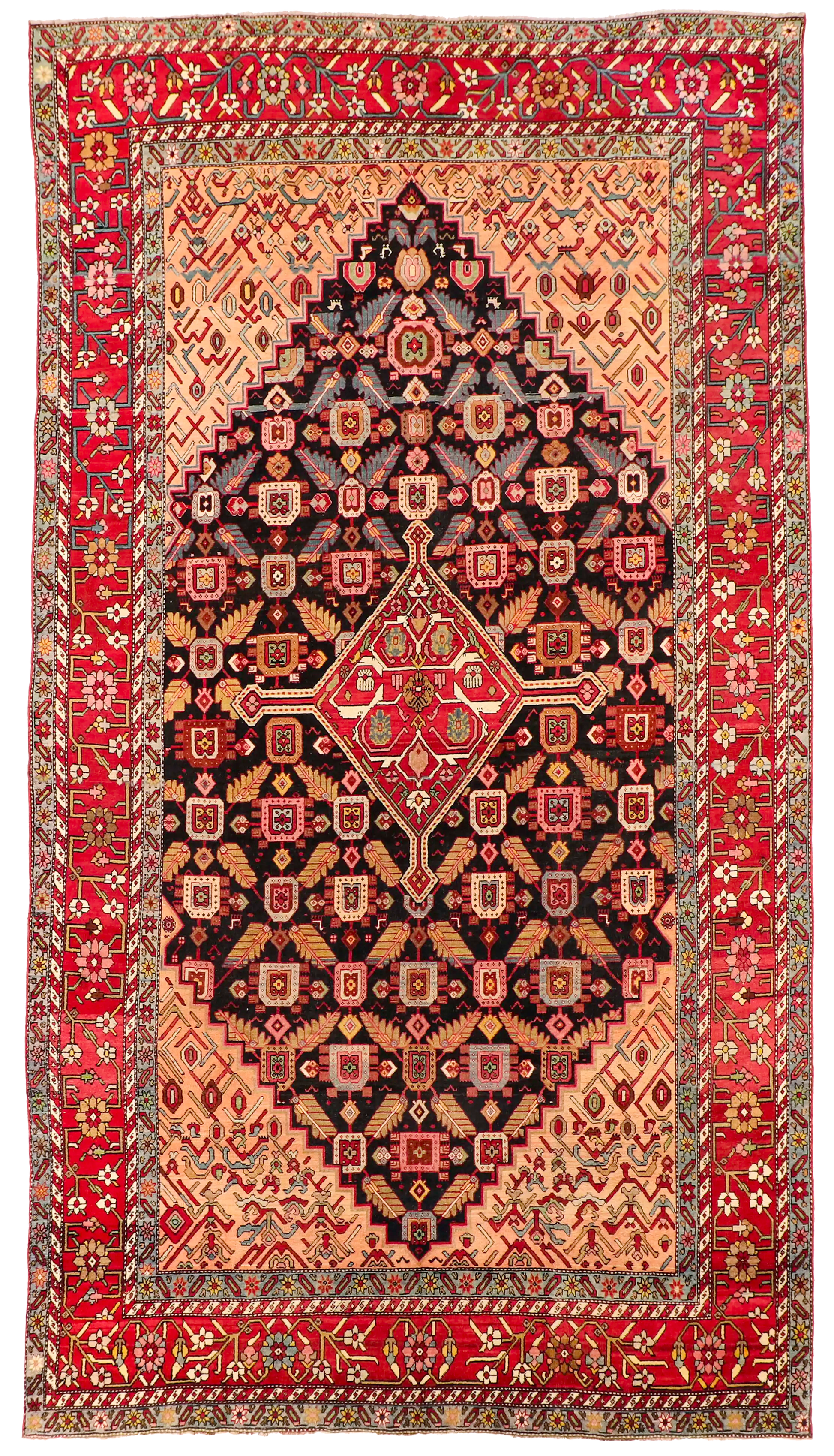 Azarbaijan rugs are known for their bold geometry, symbolic motifs, and architectural composition. This piece reflects the strength and rhythm of Caucasian weaving traditions, offering a powerful, heirloom-quality rug designed to anchor expansive interiors.
