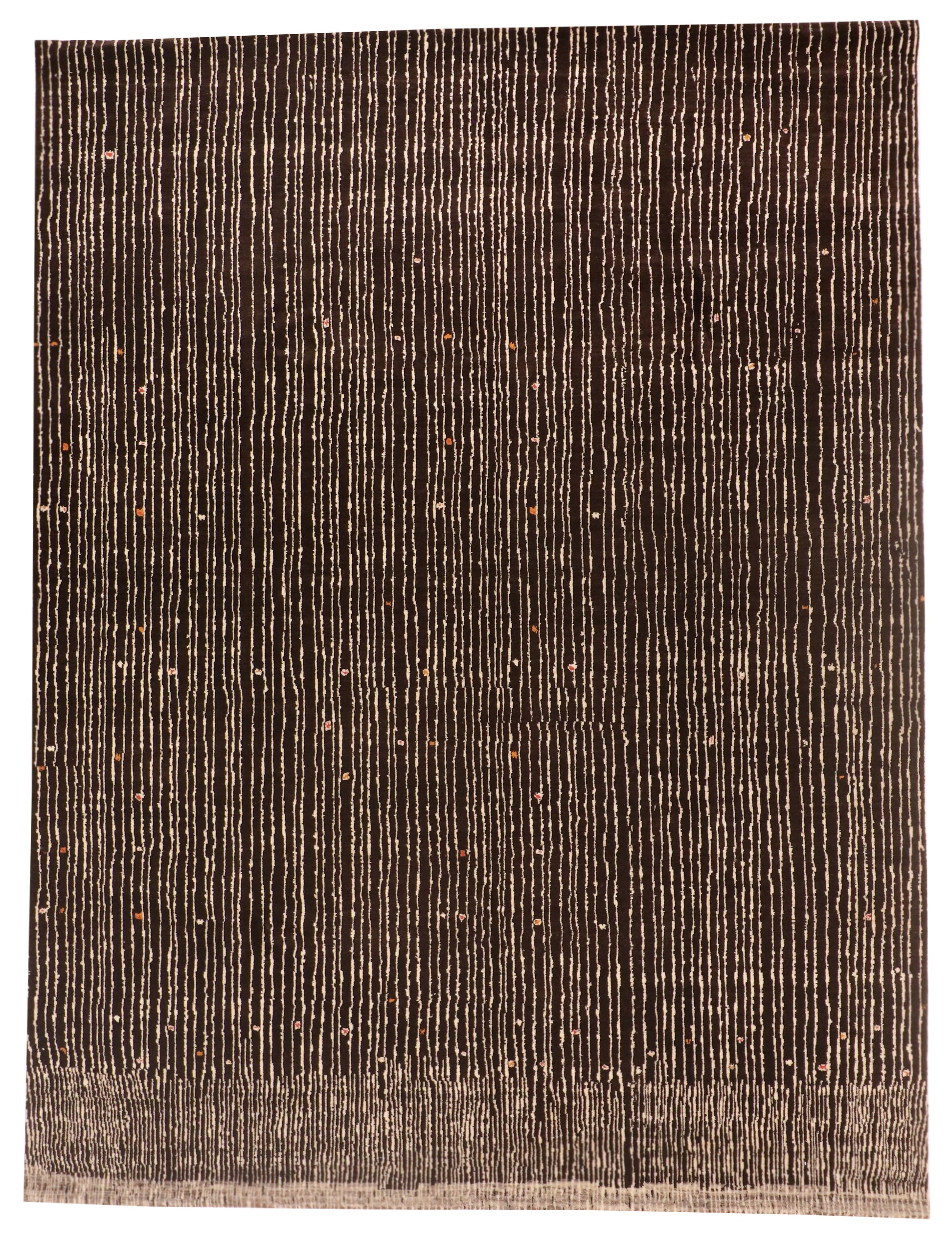 This Modern rug presents a sophisticated, minimalist interpretation of contemporary textile art. A rich espresso-brown field is traversed by hundreds of fine, hand-drawn vertical ivory lines—creating a striking sense of movement, rhythm, and texture. Small, scattered flecks of soft rust, blush, and warm neutrals add depth and artistic nuance without interrupting the rug’s refined, linear flow. The result is a dramatic yet balanced statement piece perfect for modern living.
