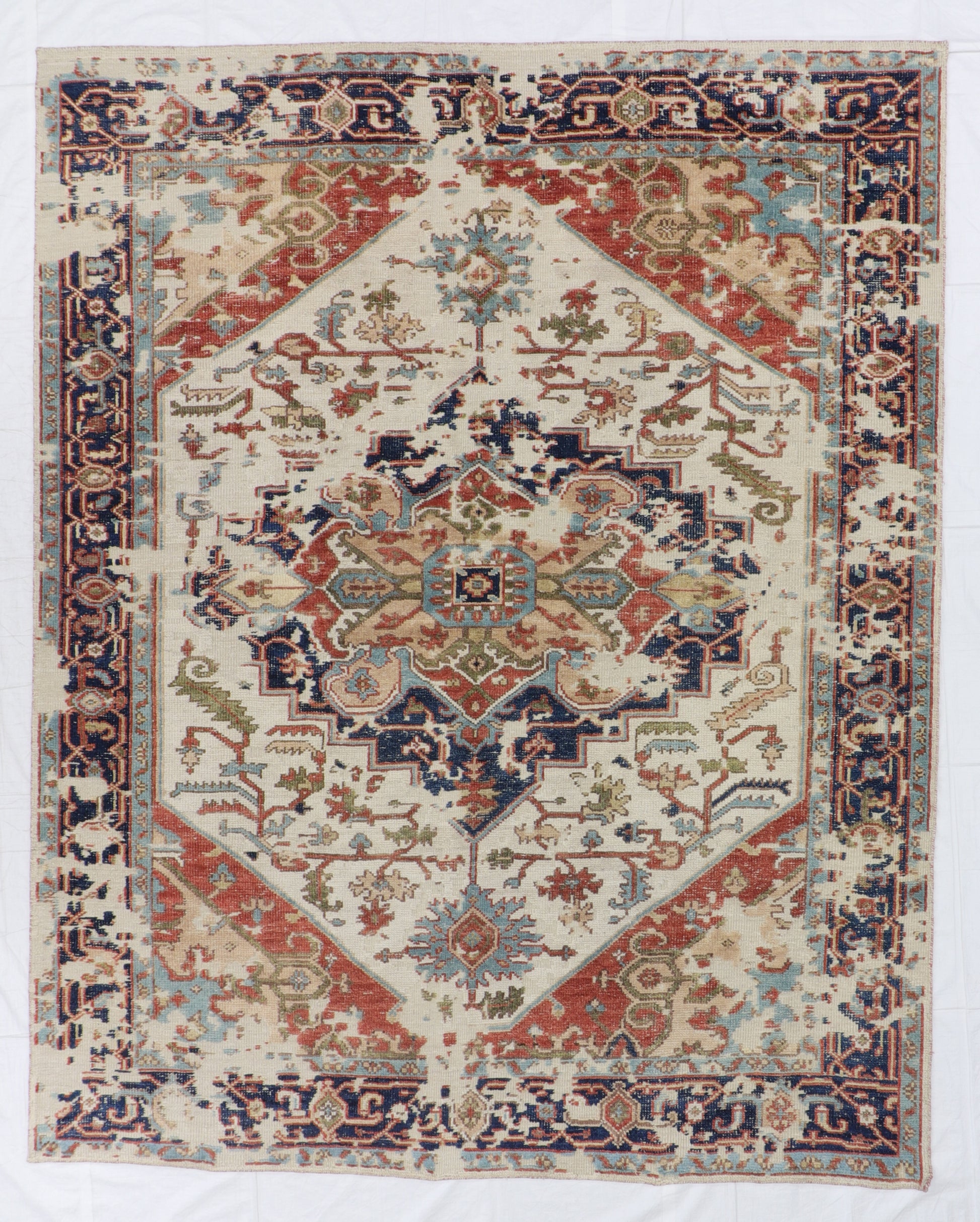 This Serapie rug showcases a beautifully articulated allover medallion layout—filled with angular floral forms, stepped geometry, and stylized botanical elements arranged across a warm ivory field. Rich tones of rust, navy, sky blue, soft sage, and muted gold add depth and visual rhythm, while the open spacing and crisp linework maintain the stately refinement Serapie pieces are celebrated for.